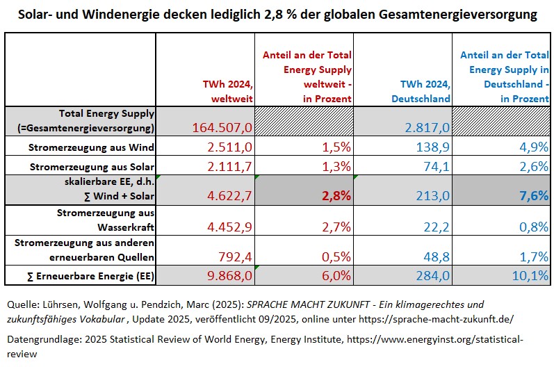 „Der Anteil von Wind und Solar an der globalen Gesamtenergieversorgung beträgt im Jahre 2024 2,8 %.“
